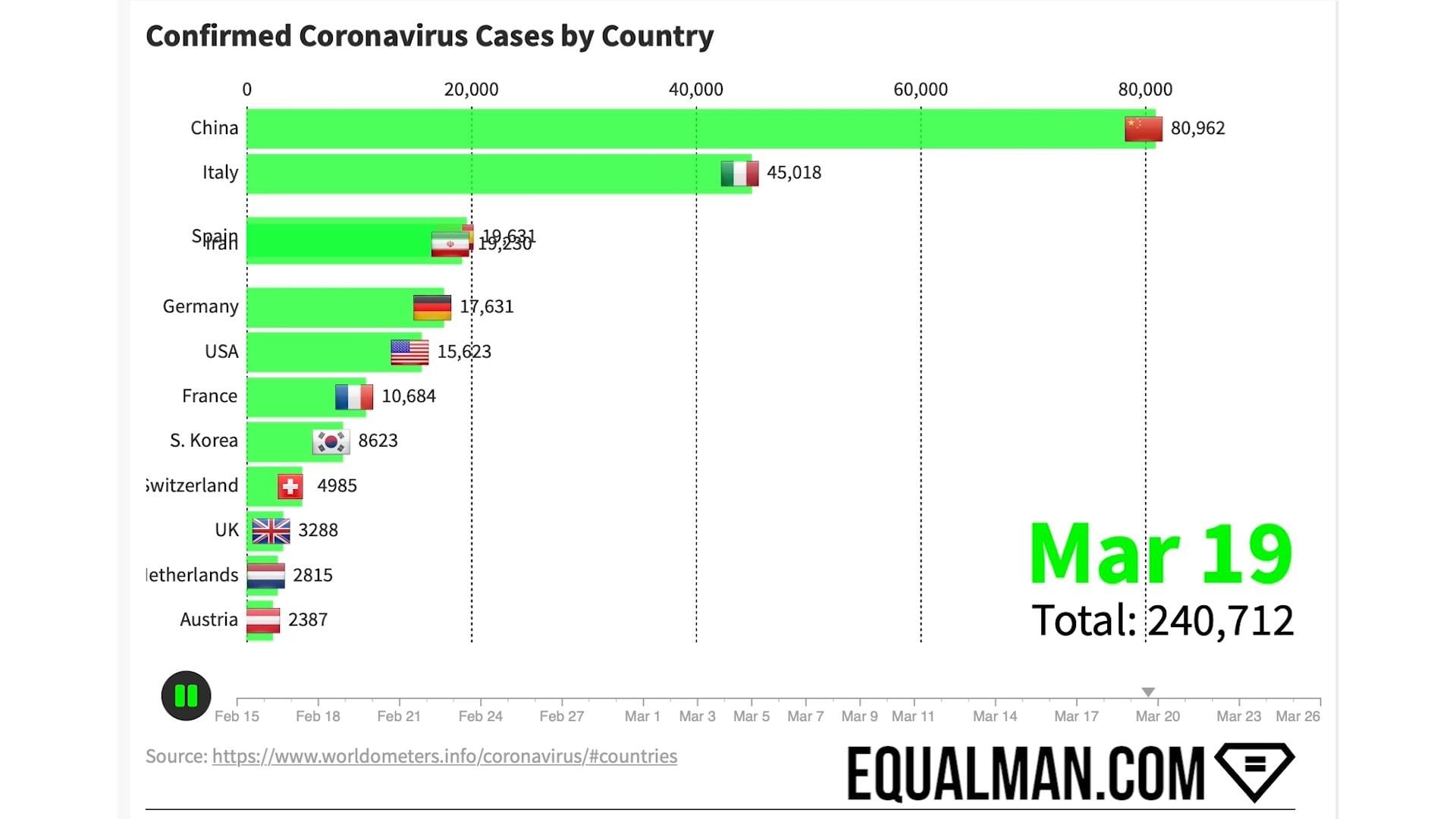 We are having our animators at Equalman Studios update these moving/dynamic graphs daily so we can see the spread of the coronavirus. We hope this helps and we will be updating daily. Large health organizations are beginning to use these so your insights and inputs are welcome and helping. Reminder that we are just animators trying to pitch in! Please note this is not an exhaustive list. It’s the Top 10. Check back daily.
